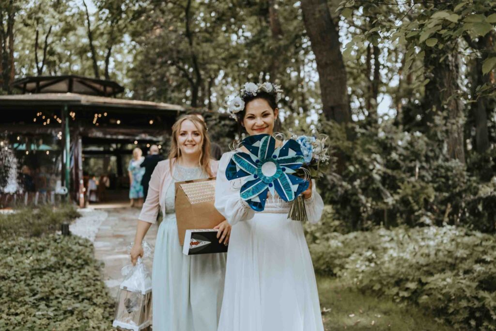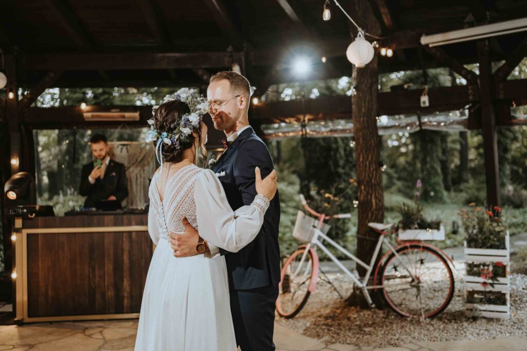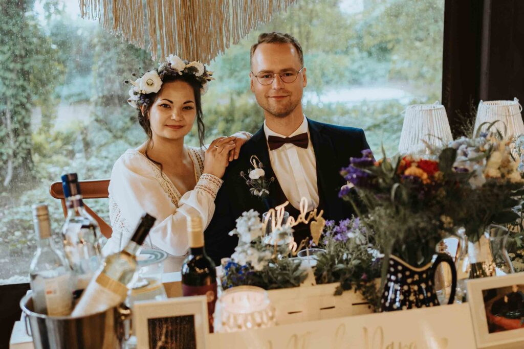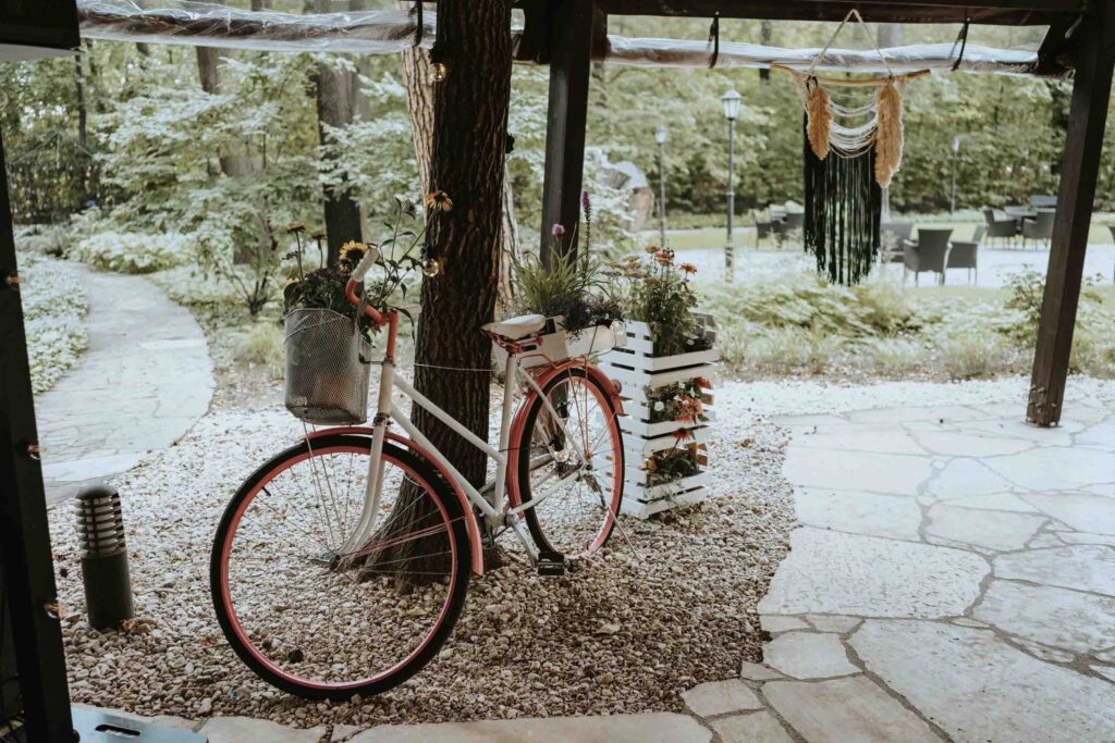 Nasza Para to miłośnicy rowerwych wycieczek i szlaków górskich. W dekoracje wystroju stołów wpletli akcent z ich wspólnych wypraw, a także umieścili ręcznie malowany na różowo rower, udekorowany kwiatami. Większość florystycznych dekoracji sama wykonała Pamela 😀